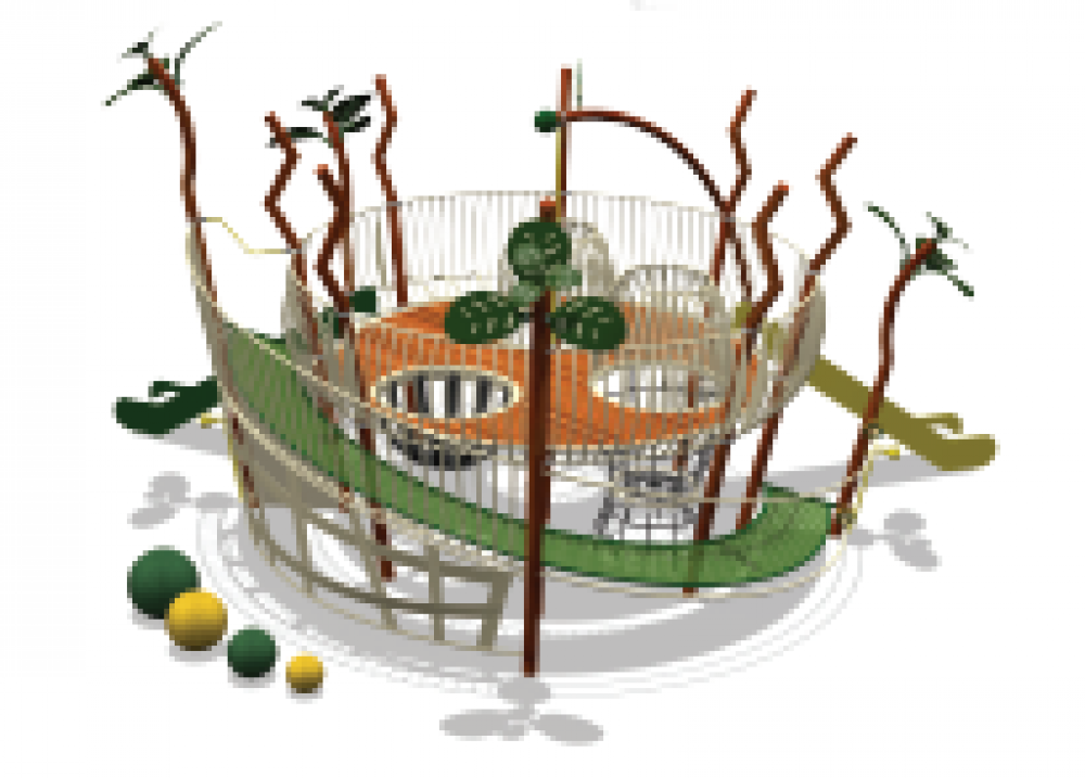COMPONENT LIST : 1.H4 Double Slide 2.H3 Slide 3.Crooked Crossing 4.Elipse Climber 5.Twisted Net Crossing 6.Rope Bridge 7.Tilted Pod Steps 8.Mushroom Steps 9.Conical Spinner 10.Arch Net Climber 11.Zig Zag Bar 12.Stone Wall Panel